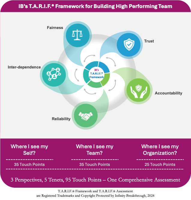 - The T.A.R.I.F.® assessment evaluates three dimensions: (a) where I see myself, (b) where I see my team, and (c) where I see my organization across 95 touch points. This provides insights for identifying challenges and gaps hindering collaboration, team effectiveness, and performance.